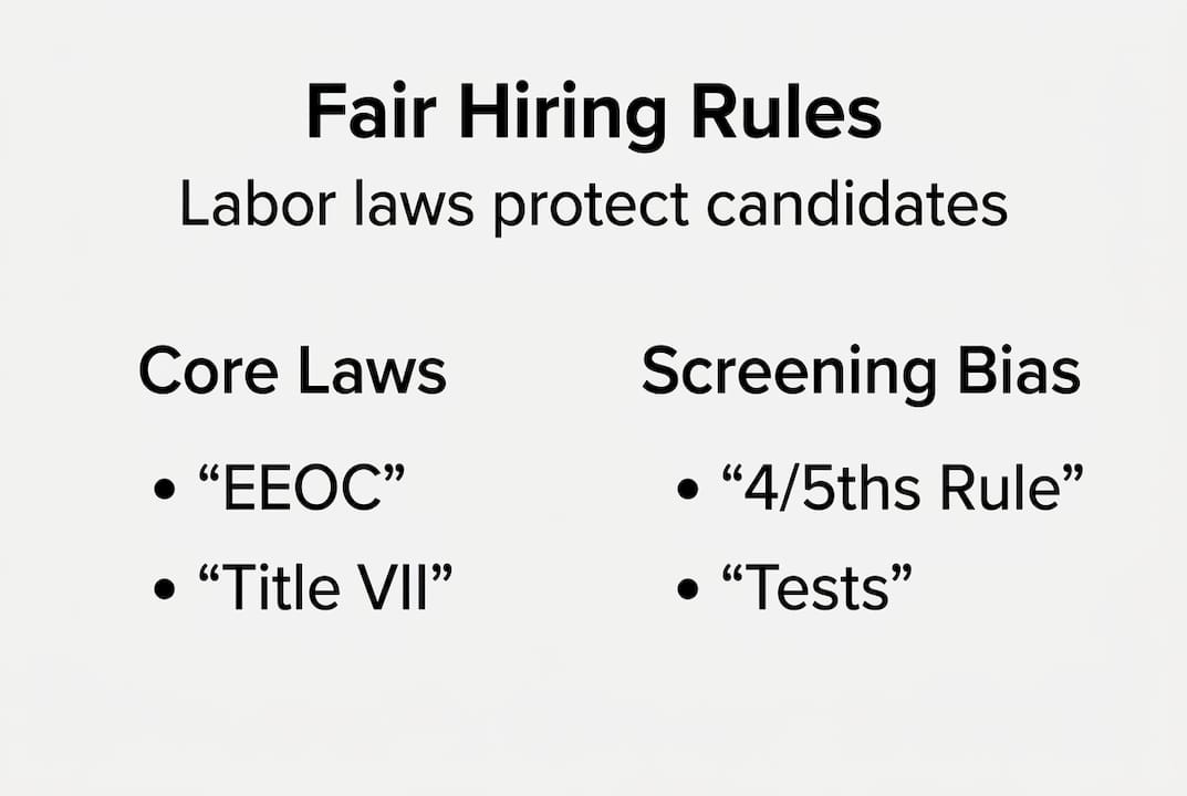 Let's be clear about what federal labor law actually prohibits. Employment laws ban discrimination based on protected characteristics throughout the entire hiring process, from the job posting to the final offer. These aren't vague suggestions. They are enforceable federal standards.