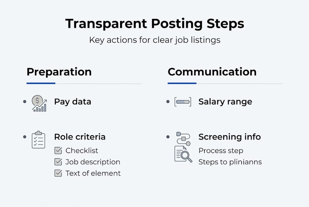 | Transparency prerequisites | Gather legal requirements, salary benchmarks, and compliance tools before creating postings. |